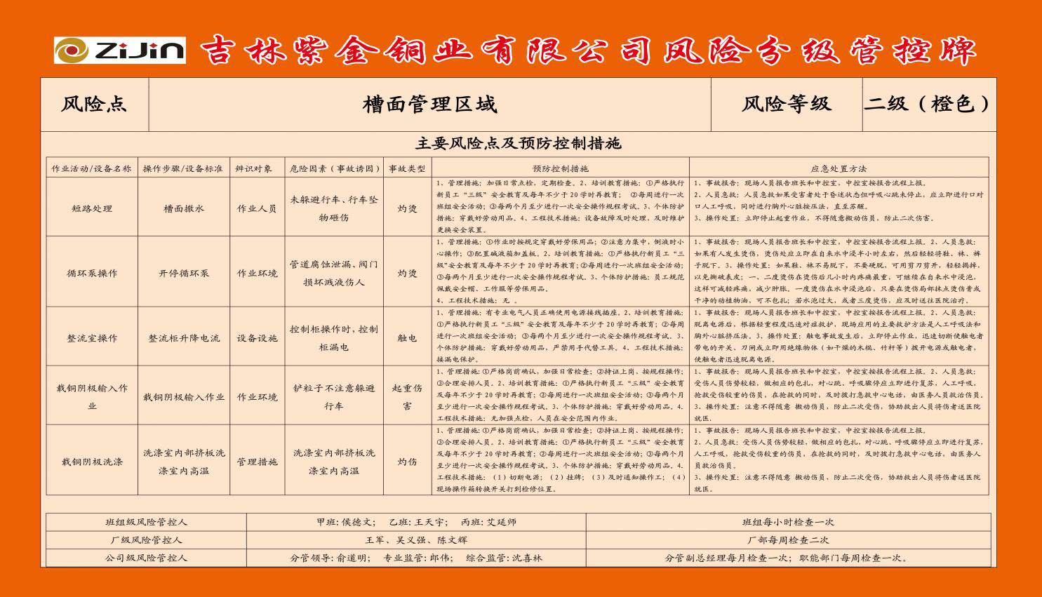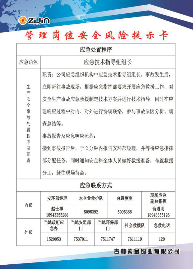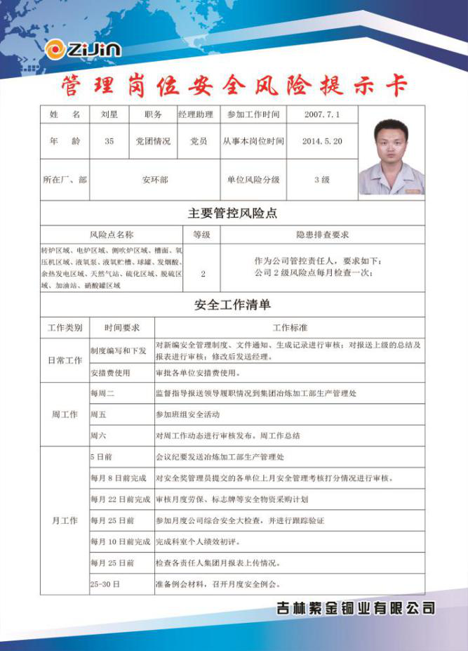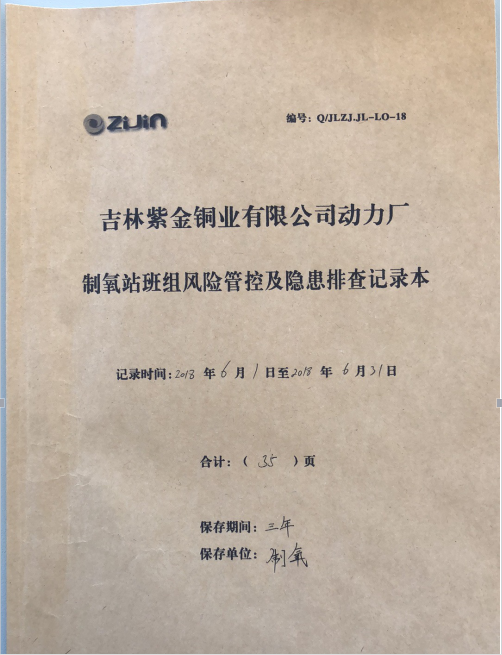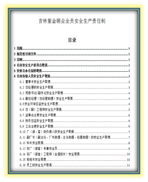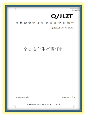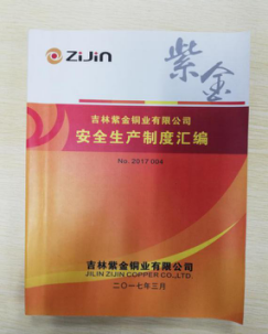 2、健全制度、落实责任:公司结合实际情况,制定全面安全生产责任制,落实各岗位安全生产责任。结合国家标准及行业规范制定公司安全生产管理各项制度、规定、考核奖惩办法,以及各项控制程序,此外还制定了职业卫生类各项管理制度,制定本单位健全的安全生产标准体系,编制《吉林紫金铜业有限公司安全生产制度汇编》发放组织学习。