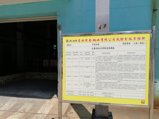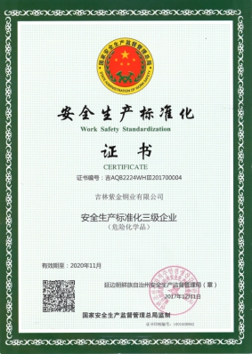 2、安全生产标准化管理体系:为进一步规范安全生产管理,吉林紫金于2017年先后开展了冶金炼铜和危险化学品安全标准化达标工作,并顺利通过延边州工业和信息化局、延边州安全生产监督管理局和专家组的考评,取得了三级安全标准化证书。