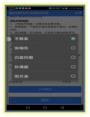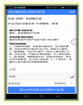 1、双重预防机制建设:编制了双重机制管理手册,构建企业安全风险分级管控和隐患排查治理双重预防机制,我公司按照作业步骤和设备设施两个方面对风险点危险因素进行辨识,明确预防控制措施、应急处置措施。通过LEC评价法,从高到低确定不同的风险等级依次为1级、2级、3级、4级,分别用红、橙、黄、蓝四种颜色表示。共汇总181个风险点,其中一级风险点0个,二级风险点20,三级风险点45,四级风险点116,并进行了隐患排查治理的分级策划,明确了各级风险的管控责任人。同时,在公司生产区域设置安装风险管控牌和NFC芯片,为风险管控人发放了108部NFC手机,通过PC端操作,手机端巡检,实现对公司各级风险点的在线管控,上级可以查看下级的巡检记录,漏检时会在手机端显示漏检记录。另外,通过绘制风险点分布图,可以直观的看出各级风险点分布位置,发放风险管控卡,让全体员工掌握自身管控危险因素和预防措施。