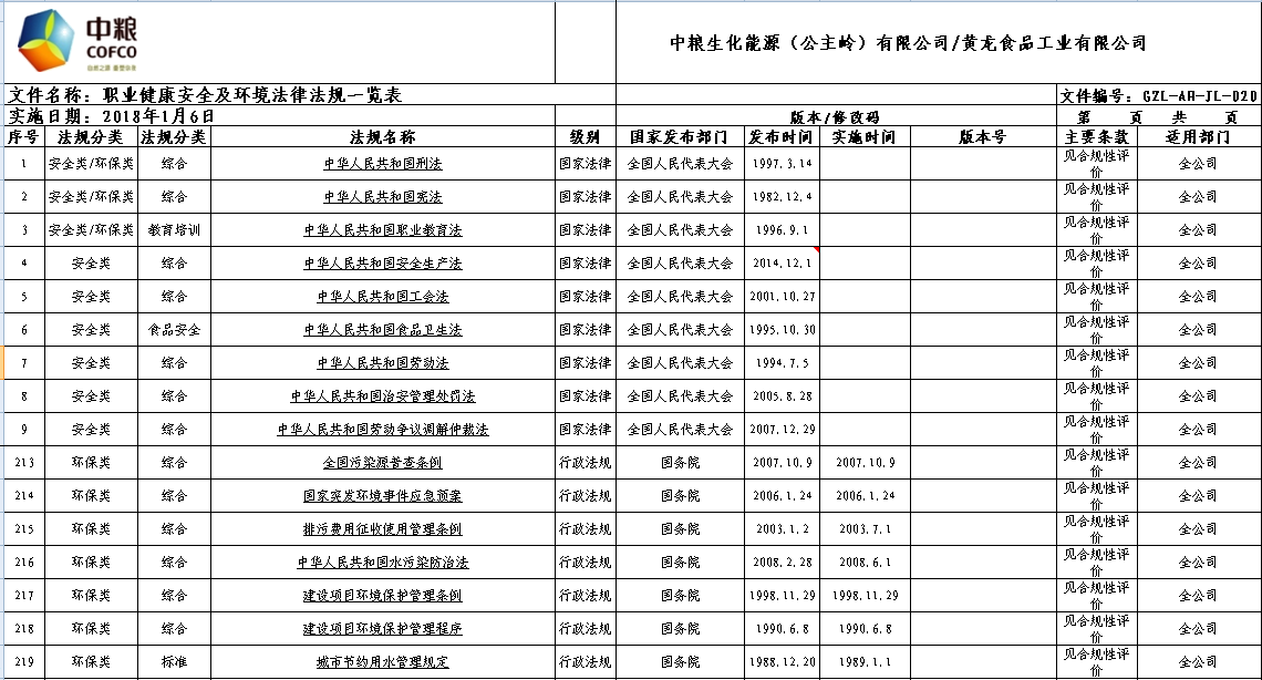 识别和获取适用本单位的安全生产法律法规、标准规范,涵盖通用法律、职业健康、劳动防护、特种设备、电气管理、应急预案、危化品、消防、交通运输、教育培训管理等方面,辨识全面,并已融入到有关制度中,定期进行细化和完善,并有效实施,实现安全管理、操作行为、设备设施和作业环境标准化。