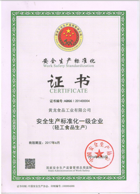 (一) 安全生产标准化创建取得突破性进展。为进一步规范安全生产管理,黄龙食品工业有限公司于2014年先后开展了轻工食品生产安全标准化达标创建工作,并顺利通过国家安全生产监督管理总局及专家组的考评,取得了一级安全标准化证书。