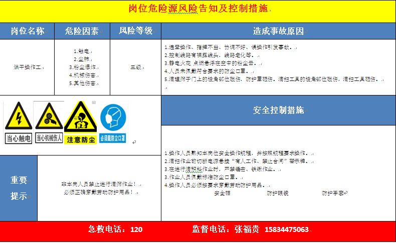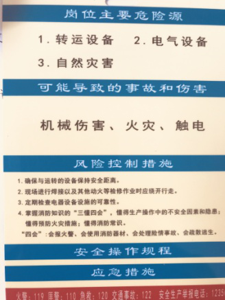 通过开展双重预防机制建设对人员作业活动、设备设施的辨识,判定为红色、橙色、黄色的风险单元,公司制作了安全风险告知卡并分别悬挂在现场风险控制点处,以提醒和告知现场存在的安全风险和可能导致的事故类型、风险等级等相关信息,在告知卡中明确了责任部门和责任人及相应的防控措施,并通过班组活动学习使员工掌握本岗位风险及管控措施。
