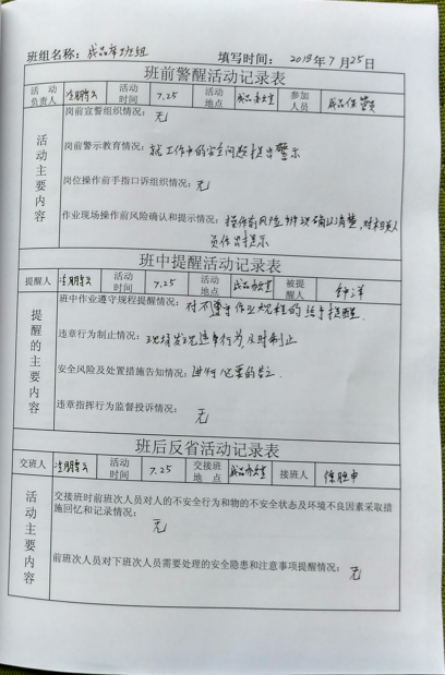 公司建立一日一醒制度,明确三醒的时间及内容,车间在交接班过程对近期国家及同行业相关事故案例进行学习、安全宣誓等,班中工作员工互相提醒,工作后进行总结并形成记录,强化风险意识,确保作业安全。