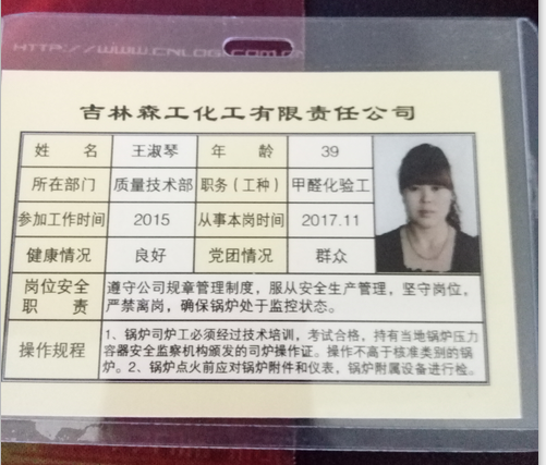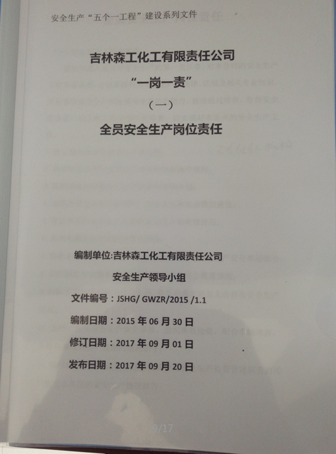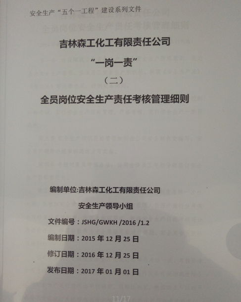 公司针对甲醛车间、动力车间、制胶车间等情况制定差异化的全员岗位安全生产责任制,落实各岗位安全生产责任,上标准岗、干标准活。
