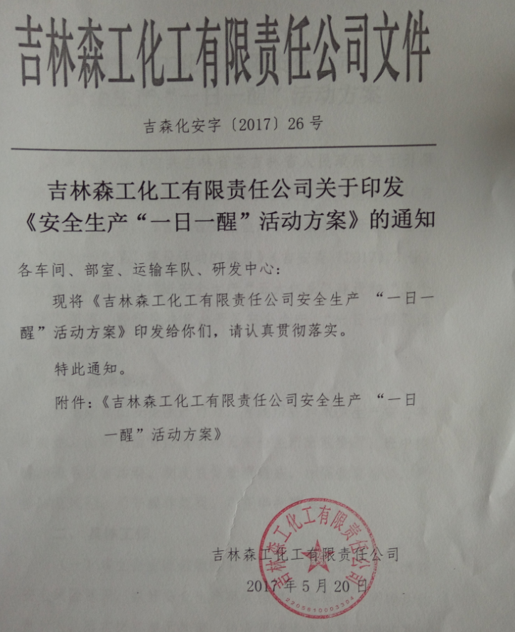 公司建立完善了安全警示教育制度,甲醛车间、动力车间、制胶车间班组每个工作日要组织员工开展班前警醒、班中提醒、班后反省的安全教育活动,强化风险意识,确保作业安全。