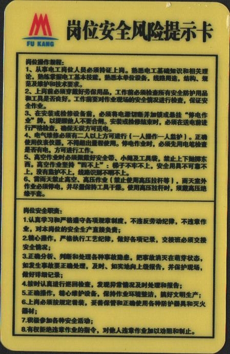 公司各岗位每名员工的基本情况、岗位风险点、预防措施、应急逃生措施、岗位操作规程和岗位安全职责做成岗位安全风险提示卡,发放到每一位员工,实现了“岗位有卡片、防范在岗前”。