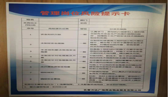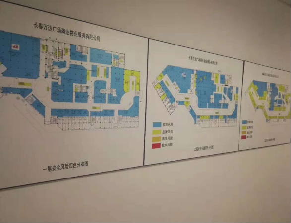 编制了双重机制《长春红旗街万达广场风险管控手册》管理手册,构建企业安全风险分级管控和隐患排查治理双重预防机制,我公司按照作业步骤和设备设施两个方面对风险点危险因素进行辨识,明确预防控制措施、应急处置措施。通过LEC评价法,从高到低确定不同的风险等级依次为1级、2级、3级、4级,分别用红、橙、黄、蓝四种颜色表示。共汇总1375个风险点,其中一级风险点0个,二级风险点20,三级风险点484,四级风险点891,并进行了隐患排查治理的分级策划,明确了各级风险的管控责任人。同时,在公司运营区域设置安装风险管控牌和手机线上巡检任务,以及集团安全隐患管控系统,通过PC端操作,手机端巡检,实现对公司各级风险点全覆盖在线管控,区域公司及集团总部可以查看下级的巡检记录,漏检时会在手机端显示漏检记录,实现全覆盖检查及监、管分离;另外,通过绘制风险点分布图,可以直观的看出各级风险点分布位置,发放风险管控卡,让全体员工掌握自身管控危险因素和预防措施。