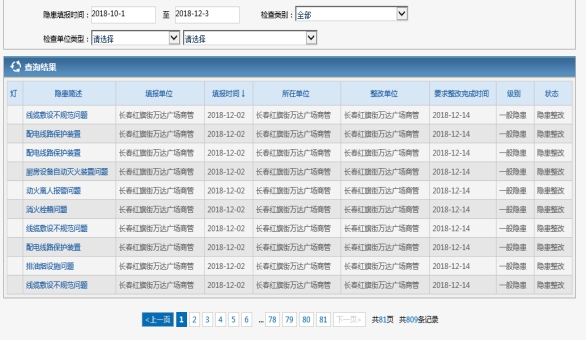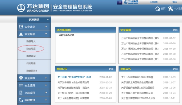 ①安全隐患填报管理体系:为进一步规范安全生产管理,万达集团统一管控,要求每周各部门联合进行安全大检查,发现难整改问题,填报安全隐患上线管控,制定整改日期,明确整改责任人,临近整改日期一周内系统自动会以短信的形式提醒整改负责人,系统内黄灯自动亮起;如整改责任人按照规定时间内未整改完成,系统会自动亮起红灯,当红灯亮起时会处罚相关责任人(整改责任人、部门负责人、分管副总、安全监督部门),如整改责任人按照规定时间内完成整改,由安全监督部门对整改问题后效果进行复核,关闭当前隐患,系统会自动亮起绿灯。