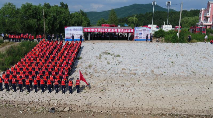 下午三点,现场总指挥一声令下实战演练正式开始,模拟的是丰满区二道水库遭受强降雨袭击引发超标准洪水,需紧急进行泄洪;二道水库上游有20名被围困群众急需救援并需要安置,通往二道水库上游道路被山体滑坡阻断,温德河段出现险情,二道水库所在地的通讯、供电、供水中断。吉林市防汛抗旱指挥部立即启动防汛二级应急响应。吉林市政府组织召开紧急防汛工作会议,安排部署防汛抢险救灾工作,立即调派水域救援人员300人、车辆50台,舟艇20艘赶赴现场救援。